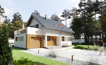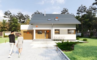 Z opisu projektanta: "Jagoda to uroczy dom z poddaszem użytkowym, który przy stosunkowo niedużej powierzchni oferuje bardzo bogaty program funkcjonalny. Parter to strefa dzienna z otwartą kuchnią i salonem, z którego wyjście prowadzi wprost do ogrodu. Na poddaszu zaplanowano trzy przytulne sypialnie oraz łazienkę. Dołączony garaż w bryle budynku zapewnia wygodę i dodatkową przestrzeń gospodarczą."
